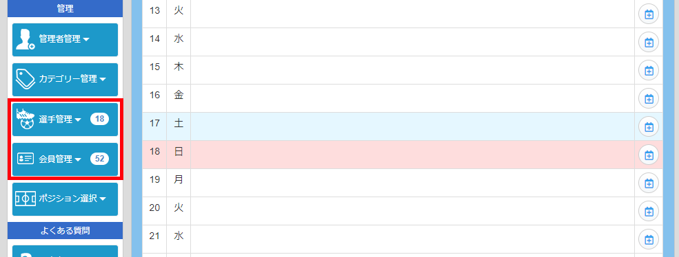 新しく追加された会員の数につきましては、新規で登録されてから1週間以内の会員の数が表示されます。カテゴリ設定が無い選手の数につきましては、選手登録後にカテゴリ設定がされていない選手が表示されます。
