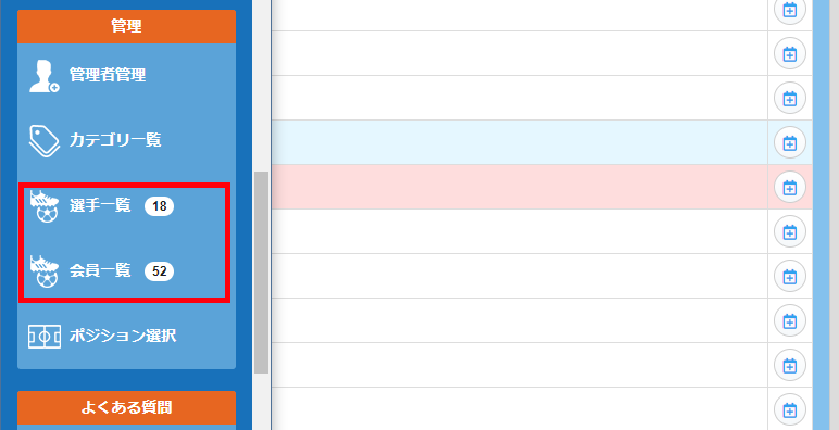 新しく追加された会員と選手(カテゴリ未設定)の数の表示箇所は以下の箇所となります。