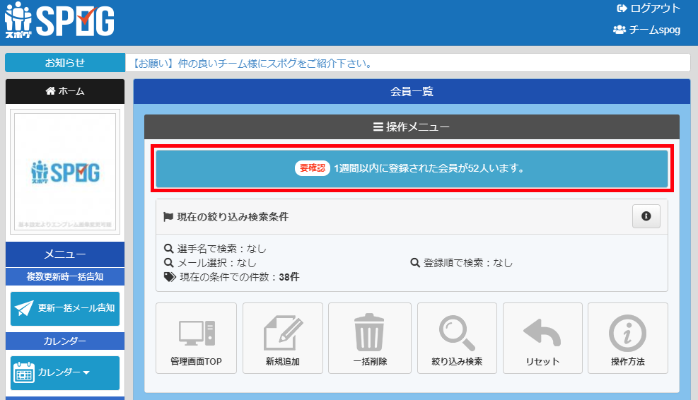 新しく追加された会員と選手(カテゴリ未設定)の数が表示されます。