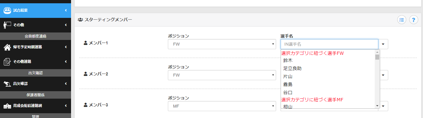 ②作成している試合結果やポジション選択に関連するカテゴリーに属する選手が分けて表示されるようになりました。