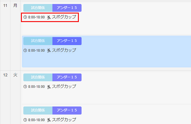 スポグのホームのスケジュール一覧やグリット表示のスケジュール一覧に、開始時間と終了時間が表示されるようになりました。